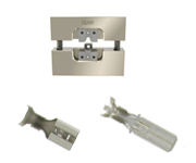 万力を利用して圧着を行うアイディアダイスセット。ファストン端子とタブ端子の兼用ダイス。マグネットで万力に固定。 ドイツ製の鋼鉄ダイス。